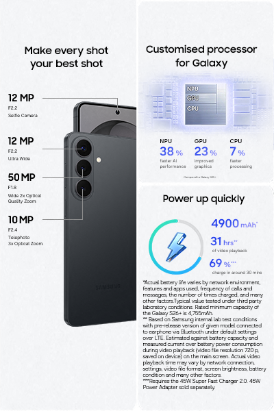 Actual battery life varies by network environment, features and apps used, frequency of calls and messages, the number of times charged, and many other factors. Estimated against the average usage profile compiled by UX Connect Research. Independently assessed by UX Connect Research between 2026.1.8-2026.1.30 in US and UK with pre-release versions of SM-S942, SM-S947 and SM-S948 under default setting using LTE and 5G Sub6 networks. NOT tested under 5G mmWave network.