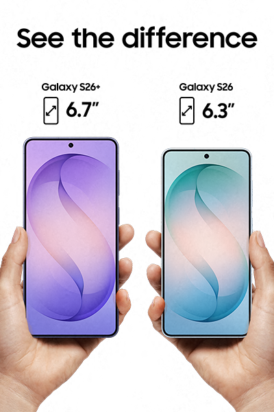Get your hands on the 6.3" Galaxy S26 display or expand your view even more with the 6.7" Galaxy S26+.6